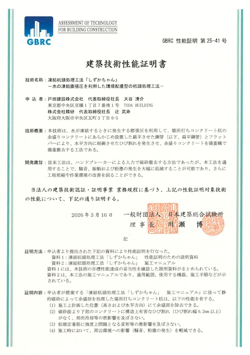 特許凍結杭頭処理工法「しずかちゃん®」は、戸田建設株式会社と株式会社精研の共同開発により、2015年に特許を取得しました。